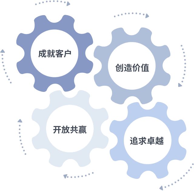 成就客户是一切决策的出发点,,,,创造价值是衡量所有工作的标准,,追求卓越是我们做事做人的态度,,,开放共赢是我们的格局也是最终的结果。。。价值观的齿轮环环相扣,,,,推动着组织里的每个人不断向前。。