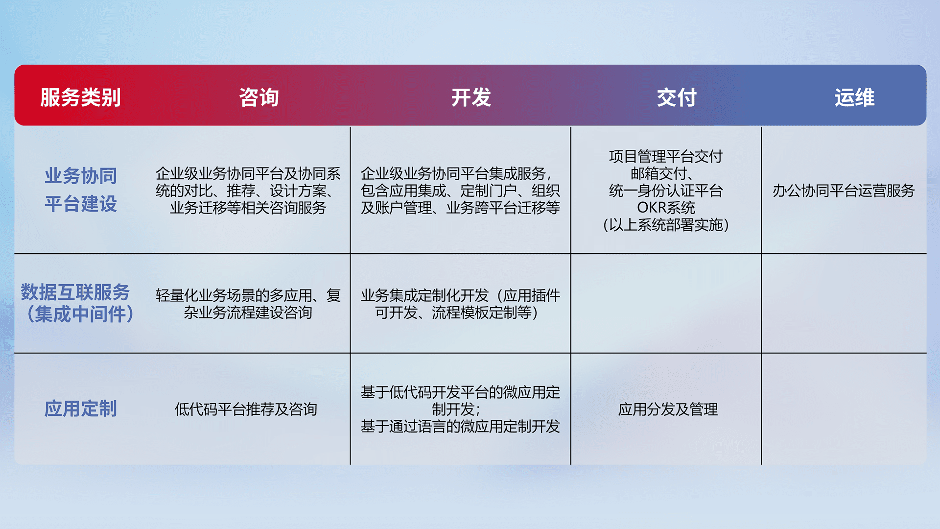 针对钉钉、、、企微、、、、IDaas等平台级产品提供产品的规划、、方案、、交付、、、、定制化开发等服务,,,,实现如统一协同办公、、、、智能客户服务、、、混合会议管理、、、智能数据查询、、、等业务场景,,,实现数字化转型。。。。